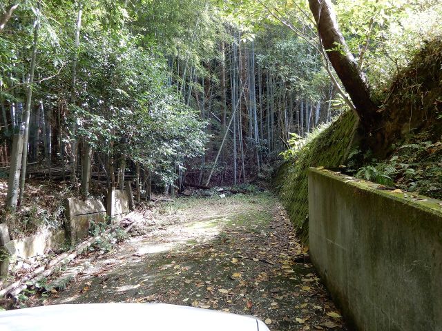 前面道路の様子。山に入っていくための道みたいな印象を受けます。物件は道の行き止まりにあります。
